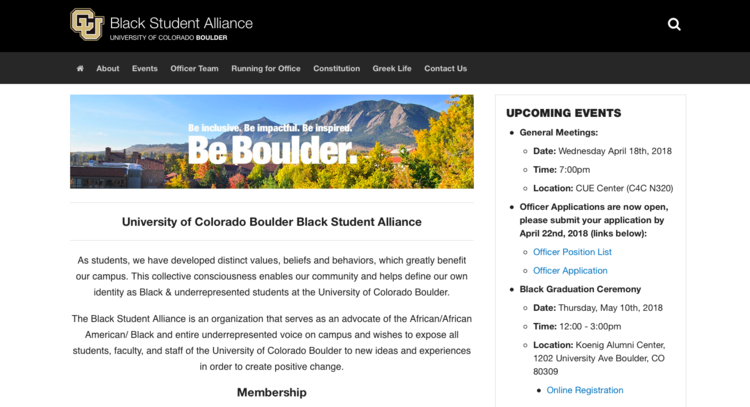 The Black Student Alliance is an organization that serves as an advocate for underrepresented voice on the campus of the University of Colorado Boulder.